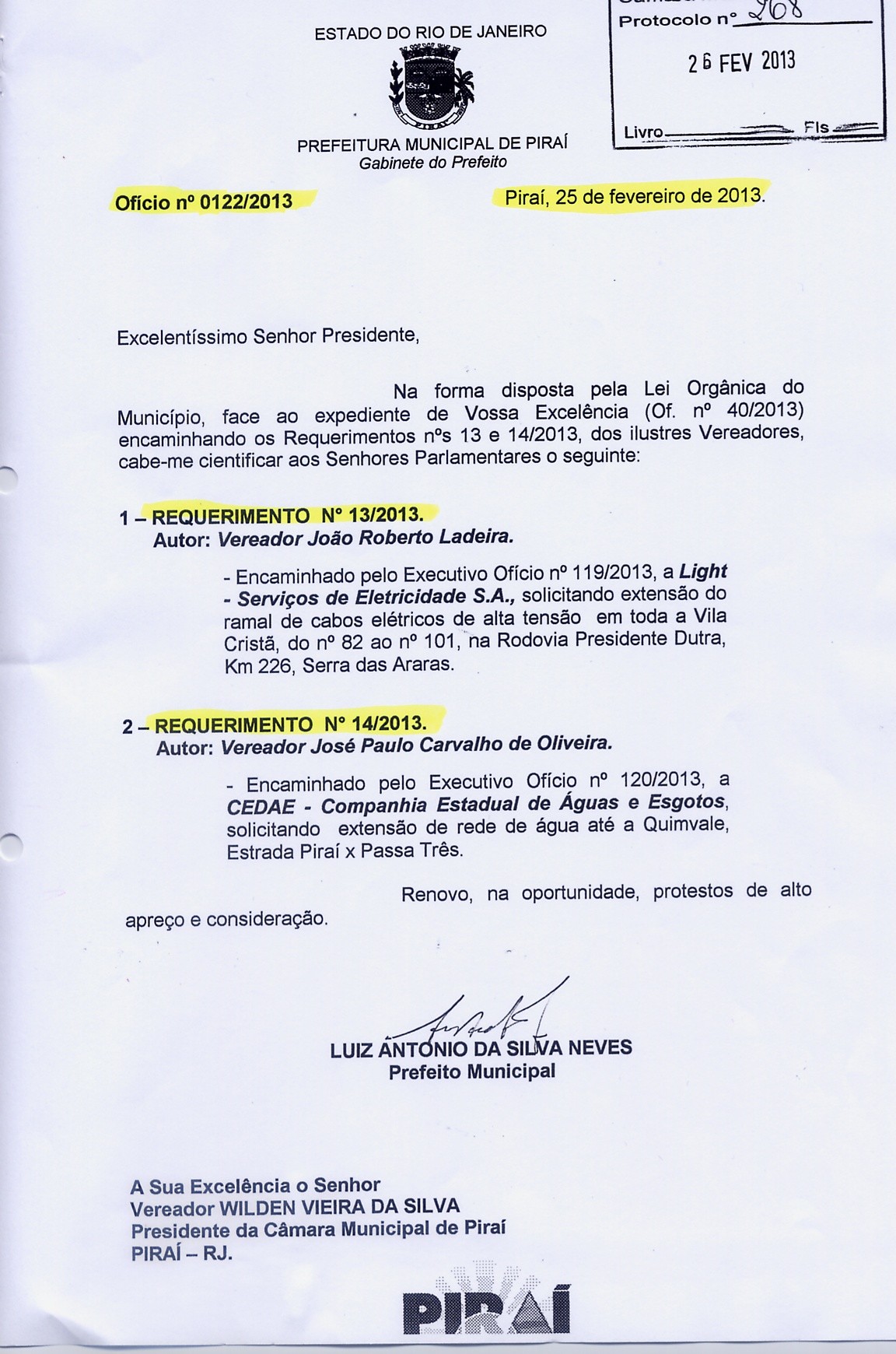 RESPOSTA AO PRESIDENTE REFERENTE AOS REQUERIMENTOS NºS13 e 14/2013