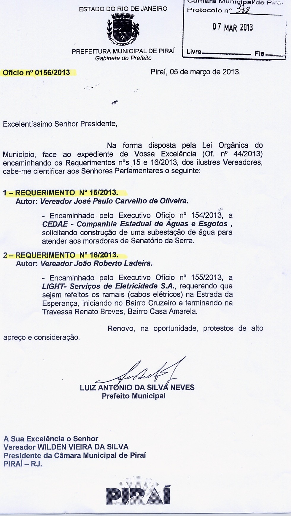 Ementa: RESPOSTA AO PRESIDENTE REFERENTE AOS REQUERIMENTOS NºS13 e 14/2013